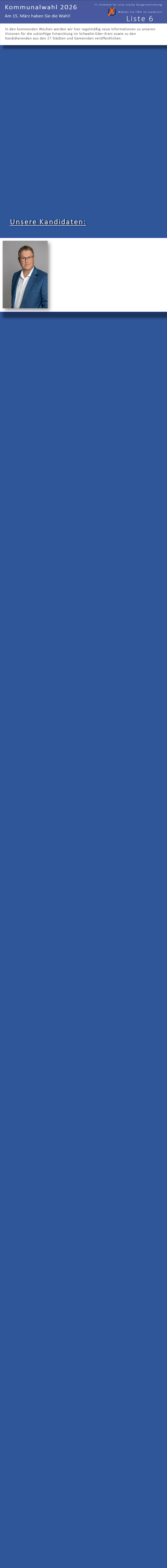 Die bei der Kommunalwahl als Liste 6 antretende Freie Wählergemeinschaft (FWG) Schwalm-Eder positioniert sich als unabhängige und bürgernahe Kraft in der Kommunalpolitik.